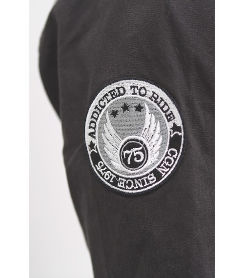 dekorativní doplňky v podobě tří nášivek (dvě na hrudi nad kapsami, jedna na pravém rukávu, metalický vzhled)